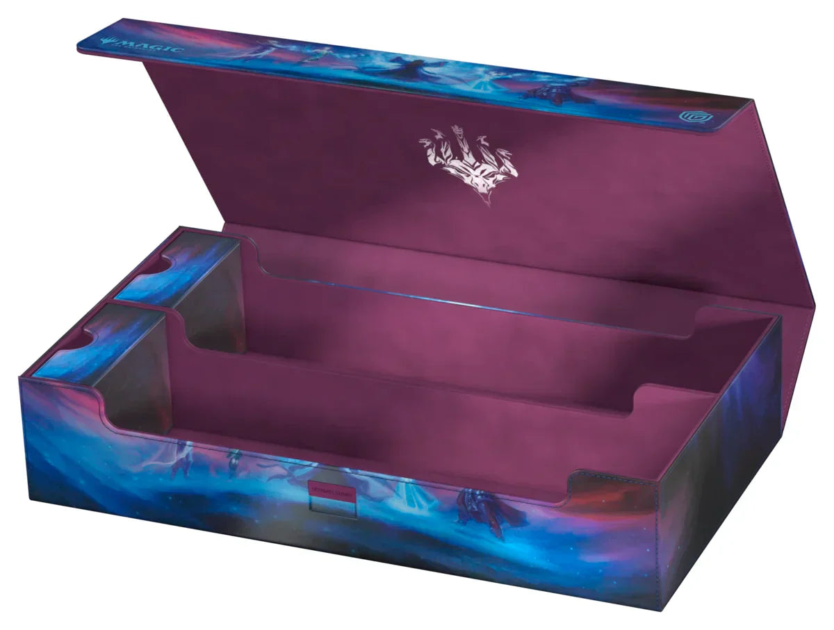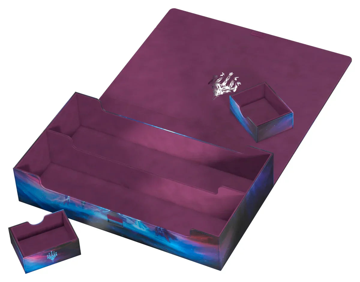 The Omnihive 1000+ Xenoskin gathers the mighty spirit dragons of Tarkir on a single deck box! Designed with two large main compartments and two flexibly positionable magnetic trays, the Omnihive can store up to 1000 single cards (double-sleeved), multiple deck boxes, accessories like dice, and/or play-mats simultaneously. The durable Xenoskin surface features the artwork Call the Spirit Dragons by Liiga Smilshkalne from Magic: The Gathering’s Tarkir: Dragonstorm set. The lid of the Omnihive is secured with strong magnets and our ZnapClaw mechanism, while the microfiber lining inside provides extra protection for cards, deck boxes, and accessories.