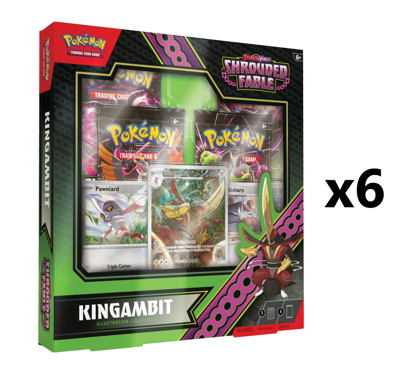 Kingambit Brings Down the Big Blade! Kingambit overcomes all challengers to become the leader of its own army! With this noble collection, you can add the Big Blade Pokemon to your team as an illustration rare-style promo card, joined by foil cards featuring Pawniard and Bisharp. You'll also find four booster packs from the special Scarlet & Violet-Shrouded Fable expansion!